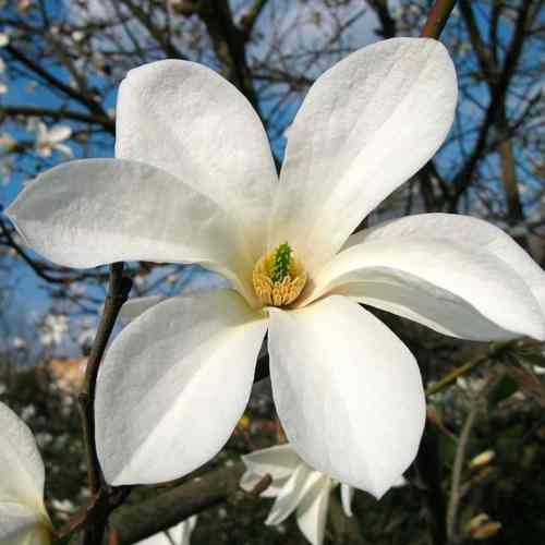 Цветет магнолия Кобус с середине весны, пока еще не распустилась полностью листва, и длится цветение около двух недель. Обычно это конец апреля.